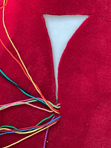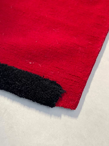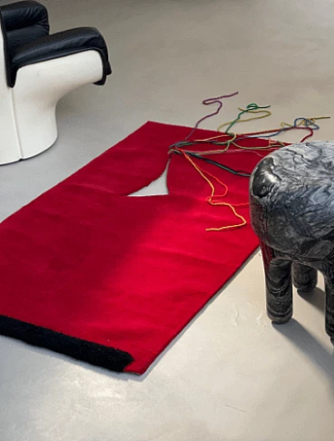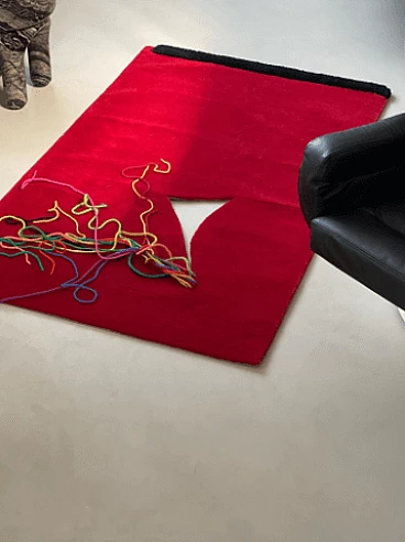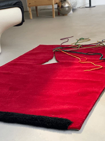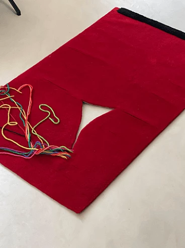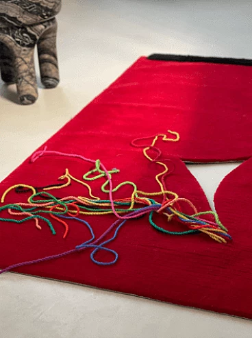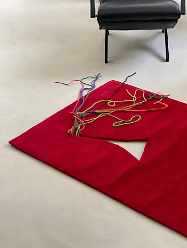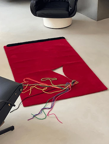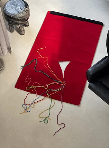 Tappeto in lana disegnato nel 1990 da Claude Picasso, figlio di Pablo Picasso, e prodotto dal marchio danese Rapsel. Annodato a mano in una vivace tonalità di rosso, ha una dimensione di 160 x 100 cm circa e si adatta alla maggior parte delle stanze. Una serie di corde colorate sono attaccate ai lati del taglio e possono essere disposte in molti modi diversi sopra o oltre la superficie del tappeto. È conservato in ottime condizioni, non è sbiadito né sgualcito, e probabilmente ha trascorso la maggior parte della sua vita in magazzino; da qui i segni visibili nelle foto a tre quarti, ma completamente scomparsi nell'immagine primaria, scattata in un momento successivo. È estremamente raro poiché è stat realizzato in un'edizione limitata di soli 50 pezzi. Può anche essere appeso alla parete.