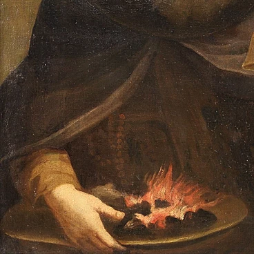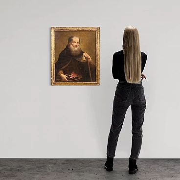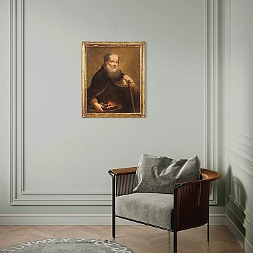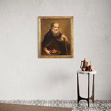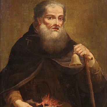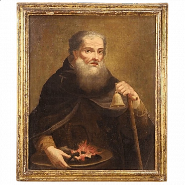 Dipinto a olio su tela del '700 raffigurante un soggetto religioso, in particolare Sant'Antonio Abate; buona mano pittorica. Cornice lignea antica, non coeva, scolpita, ridorata e adattata al dipinto nel corso del '900. Cornice strutturalmente sana che presenta diversi segni del tempo e cadute di colore (vedi foto). Quadro di bella misura e piacevole arredamento. Ha recentemente subito un intervento di restauro conservativo, ripresa del colore, sostituzione del telaio e rintelo. In buone condizioni con qualche segno del restauro. Misure senza cornice: 68 x 56 cm.