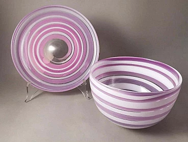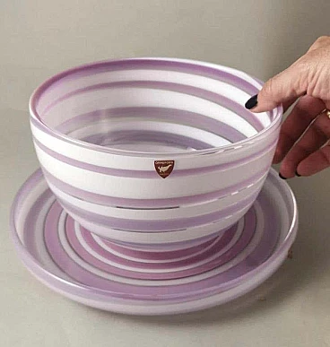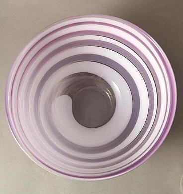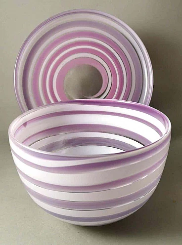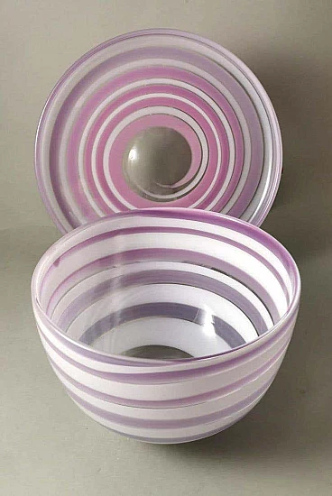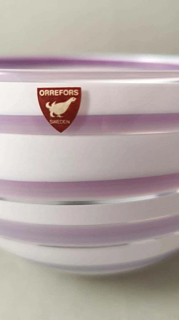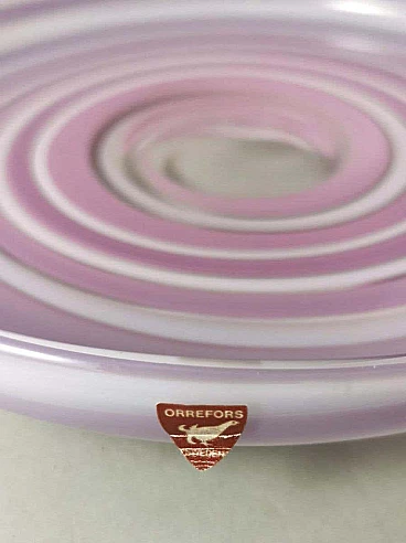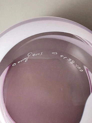 Elegante e raffinata ciotola e piatto in cristallo con disegni astratti in bianco e insolite tonalità lilla. La ciotola ha una forma classica, mentre il piatto rotondo ha un bordo leggermente rialzato. L'unicità di questi due oggetti è data dalla lavorazione e dalla colorazione che gli artigiani sono riusciti a dare al cristallo, la forma elicoidale del disegno e il colore tenue su entrambi gli oggetti li rende piacevoli, leggeri quasi eterei. Gli oggetti sono stati creati tra il 1990 e il 1995 in Svezia, a Småland, dall'azienda Orrefors. Sotto ogni articolo, inciso a mano, c'è il nome dell'azienda, poi il numero del modello e infine, trattandosi di articoli in edizione limitata, il numero dell'articolo stesso. Lo Småland è una provincia storica della Svezia meridionale che si affaccia sul Mar Baltico. La vetreria Orrefors è stata fondata nel 1898 sul sito di una vecchia fabbrica di ferro e fino al 1913 ha prodotto principalmente vetro per finestre e bottiglie. Quando il console Johan Ekman acquistò la fabbrica nel 1913, Orrefors iniziò a produrre bicchieri, vasi e altri articoli per la casa. Ekman assunse i fratelli Eugen e Knut Bergkvist, che in precedenza avevano lavorato presso Kosta Boda, oltre a Fritz Blomqvist e Heinrich Wollman, un artigiano originario di Bohemia con una lunga tradizione nella lavorazione del vetro. I primi tentativi di produrre vetro artistico erano nello stile di famose vetrerie francesi come Daum e Gallé. Prestigiosi designer, soffiatori di vetro, tagliatori, pittori e incisori hanno fatto la loro parte ogni giorno in questo lavoro di abilità, e ogni oggetto di Orrefors è un pezzo unico e sofisticato di artigianato. La vetreria Orrefors è stata chiusa nel 2012 quando Orrefors è entrata a far parte del gruppo svedese Orrefors Kosta Boda AB. Ancora oggi, tuttavia, questi oggetti vengono prodotti ed esportati in tutto il mondo, grazie all'interesse di alcuni designer scandinavi che ne hanno prolungato la genesi e il fascino per le nuove generazioni. Nel 2013, l'edificio storico della vetreria è diventato la sede del "Per Ekström Museet", un museo d'arte. Gli oggetti sono in ottime condizioni. Misure ciotola diametro 19 cm, altezza 12 cm, piatto diametro 24 cm, altezza 3 cm. Per tutte le nostre spedizioni utilizziamo materiali di imballaggio speciali (casse di legno su misura, polistirolo, etc.) per la massima protezione e sicurezza degli oggetti.