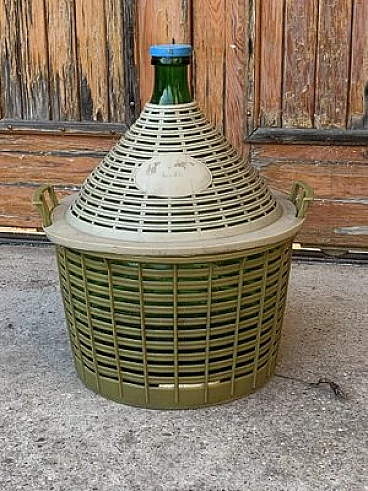 Damigiana ungherese in vetro verde con cesto in plastica, anni '50