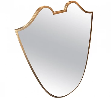 Specchio da parete a forma di scudo con cornice in ottone nello stile di Gio Ponti, anni '50. Incredibile specchio da parete in ottone massiccio disegnato e prodotto in Italia alla maniera di Gio Ponti, che utilizzava questo tipo di specchio nelle più belle case milanesi degli anni '50. L'ottone ha una bella patina, il vetro è quello originale e ha un difetto visibile nelle foto (su richiesta è possibile cambiare gratuitamente il vetro in un paio di giorni). La forma a scudo era un segno distintivo degli specchi disegnati da Gio Ponti. Questo specchio è uno splendido pezzo di design che incarna l'essenza dell'estetica della metà del secolo scorso. Mette in mostra il suo caratteristico mix di funzionalità, eleganza e influenze moderniste. Ha una presenza audace e accattivante, che lo rende un punto focale in qualsiasi stanza. La forma ricorda gli scudi delle antiche armature, aggiungendo un tocco di riferimento storico al design. La cornice è realizzata in ottone, un materiale molto diffuso a metà del secolo scorso. La calda tonalità dorata dell'ottone completa la superficie riflettente dello specchio, creando un effetto visivo armonioso. La struttura in ottone è elegante e minimalista, con linee pulite e una finitura liscia, che mette in mostra la semplicità e la raffinatezza del design moderno di metà secolo. Lo specchio stesso è di grandi dimensioni e consente di riflettersi e di fungere da elemento funzionale e decorativo nella stanza. La superficie riflettente è chiara e senza fronzoli, per enfatizzare lo scopo dello specchio e migliorare l'illusione di spazio e luce nell'area circostante. La sua combinazione di forme organiche e geometriche, insieme all'uso di materiali di alta qualità, esemplifica l'impegno dell'epoca sia per la forma che per la funzione.