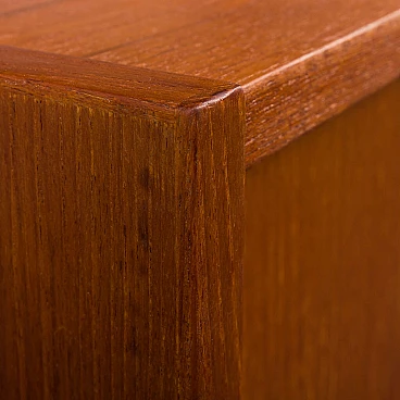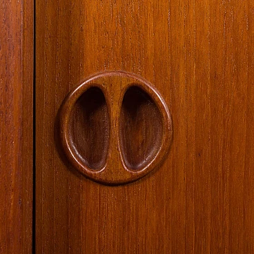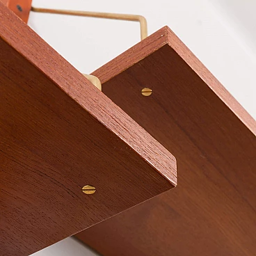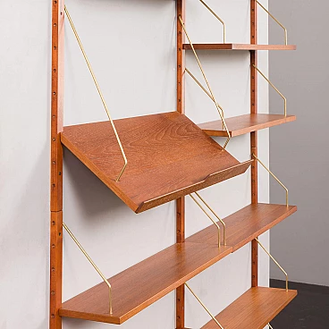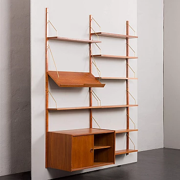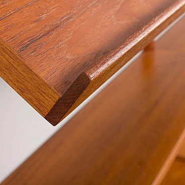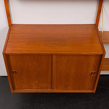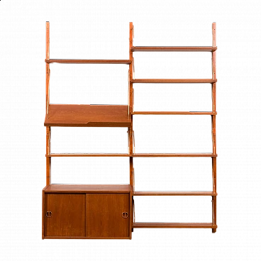 Libreria danese in teak nello stile di Poul Cadovius e Preben Sorensen, anni '60. Dotata di otto mensole, un ripiano espositivo e un mobiletto ad ante scorrevoli. È un sistema di scaffalature interamente modulare. Tutti gli elementi sono larghi 80 cm e possono essere disposti a piacimento utilizzando ganci in ottone. È dotata di sei binari lunghi 100 cm combinati in tre. I ripiani e il mobiletto possono essere appesi più in basso, più in alto o in un'altra sezione. Le otto mensole sono profonde 20 cm. Il mobiletto con ante scorrevoli e ripiano interno è alto 43,5 cm, largo 80 cm e profondo 45 cm. I sei binari in legno massello sono lunghi 100 cm ciascuno. Il mobile è stato controllato: le ante funzionano correttamente e tutte le parti combaciano bene; è stato totalmente restaurato. Fantastiche condizioni vintage con lievi tracce d'uso, in particolare un segno circolare sulla parte superiore del mobile (vedi foto), ma ciò non pregiudica in modo significativo le condizioni generali e l'estetica.