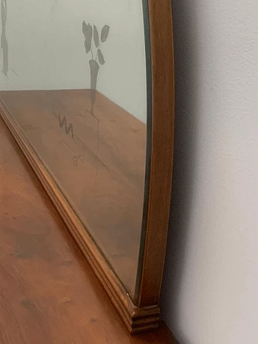 Specchio a mezzaluna in noce con vetro decorato, anni '40