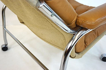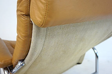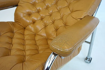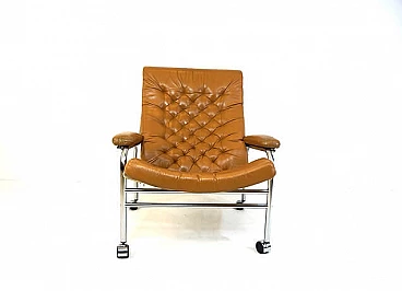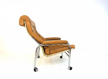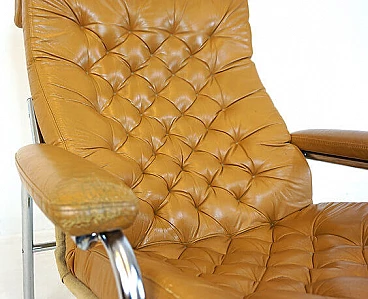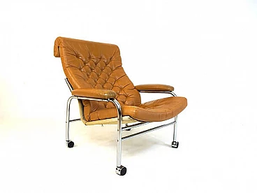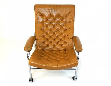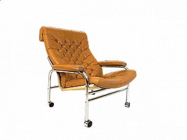 Poltrona Bore in pelle color caramello di Noboru Nakamura per Ikea, anni '70. La pelle del cuscino della seduta è morbida, la struttura dei bottoni è intatta e senza danni. Il rivestimento in pelle dei braccioli presenta una patina sugli angoli anteriori che conferisce alla poltrona un certo fascino. La fodera sul retro in lino color naturale è solida. La leggera struttura cromata è su ruote e conferisce alla poltrona un elevato livello di flessibilità. Il designer giapponese Noboru Nakamura ha lavorato per diversi anni per il produttore svedese Ikea ed è stato uno dei designer più influenti. Altezza della seduta: 36 cm. Profondità della seduta: 47 cm.