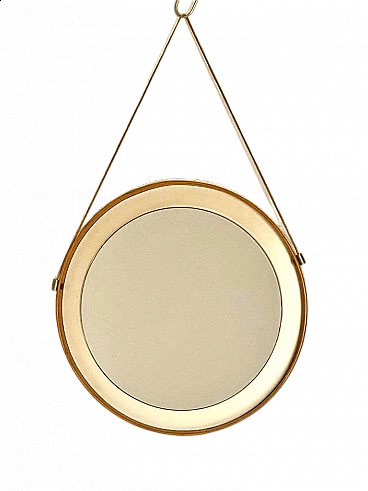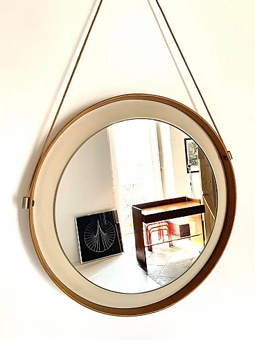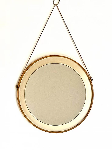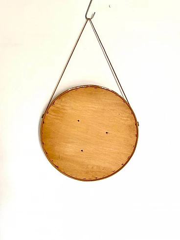 Specchio rotondo con struttura in legno ed ecopelle, anni '60
