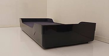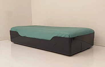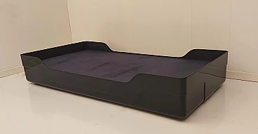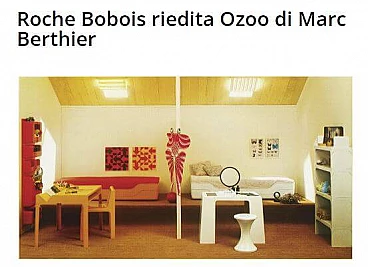 Rarissimo esemplare della collezione Ozoo nata nel 1968 dalla matita di Marc Berthier per Roche & Bobois che ha segnato un’epoca. Simbolo dell’evoluzione delle tecniche e dei materiali negli anni ‘60, la collezione Ozoo rappresentava il sogno moderno della plastica applicata all’arredamento: leggerezza, industrializzazione, resistenza sia indoor che outdoor, colori “pop-ottimisti”. Fratello minore dello scrittoio e della sedia dell’omonima serie, anche il letto singolo, che proponiamo nel colore blu navy, è realizzato, come dichiara lo stesso Berthier, “in un unico pezzo, come un monolite, che rappresentava, all’epoca, una vera performance...Queste creazioni sono state per me importanti in termine di riconoscimento a livello internazionale, in modo particolare presso i musei. Soprattutto mi ricordano che la creatività industriale è l’opera d’un quartetto inseparabile: il designer che crea l’oggetto, l’industriale che crea lo strumento specifico per la sua produzione, il distributore che crea le condizioni per metterlo in risalto e l’editore che è e resta l’attore principale, il coordinatore. Per la collezione Ozoo si è trattato di un trio: François Roche, M. Dhaussy (il produttore) ed io, in simbiosi”.