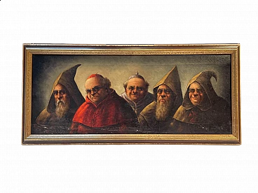 Dipinto che ritrae diversi esponenti del clero quali frati e cardinale sorridenti con fare grottesco. Sul retro cogliamo una firma in matita non riconoscibile. Olio su tela, presenta una cornice semplice in legno dorata. Epoca XIX secolo.