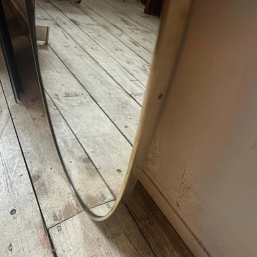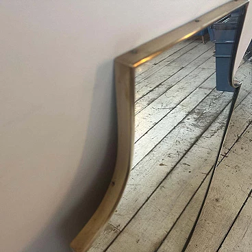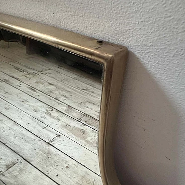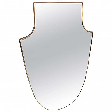 Specchio da parete in ottone massiccio disegnato e prodotto in Italia alla maniera di Gio Ponti che utilizzava questo tipo di specchio nelle più belle case milanesi degli anni '50. L'ottone è in una bella patina originale, il vetro è quello originale. La forma a scudo era un segno distintivo degli specchi disegnati da Gio Ponti. Questo specchio da parete è uno splendido pezzo di design vintage che incarna l'essenza dell'estetica della metà del secolo scorso. Questo specchio mette in mostra il suo caratteristico mix di funzionalità, eleganza e influenze moderniste. Lo specchio ha una presenza audace e accattivante, che lo rende un punto focale in qualsiasi stanza. La forma dello scudo ricorda gli scudi delle antiche armature, aggiungendo un tocco di riferimento storico al design. La cornice dello specchio è realizzata in ottone, un materiale molto diffuso a metà del secolo scorso. La calda tonalità dorata dell'ottone completa la superficie riflettente dello specchio, creando un effetto visivo armonioso. La struttura in ottone è elegante e minimalista, con linee pulite e una finitura liscia, che mette in mostra la semplicità e la raffinatezza del design moderno di metà secolo. Lo specchio stesso è di grandi dimensioni e consente di riflettersi e di fungere da elemento funzionale e decorativo nella stanza. La superficie riflettente è chiara e senza fronzoli, per enfatizzare lo scopo dello specchio e migliorare l'illusione di spazio e luce nell'area circostante. Questo specchio da parete racchiude lo spirito del design degli anni Cinquanta. La sua combinazione di forme organiche e geometriche, insieme all'uso di materiali di alta qualità, esemplifica l'impegno dell'epoca sia per la forma che per la funzione. Questo specchio è un pezzo di design senza tempo che continua a ispirare e affascinare gli appassionati dell'estetica moderna di metà secolo.