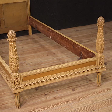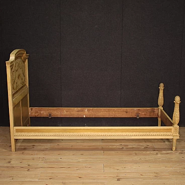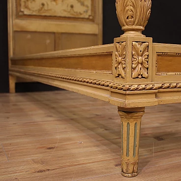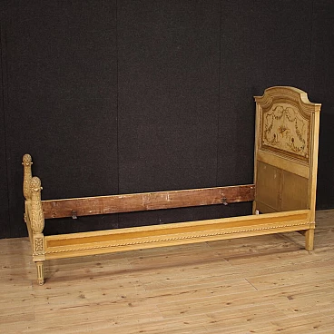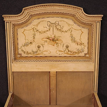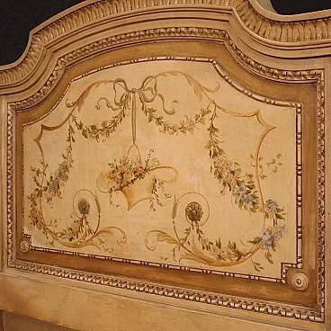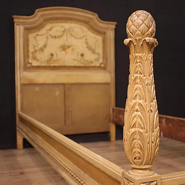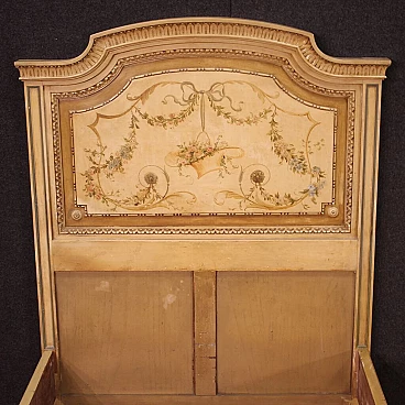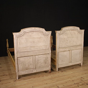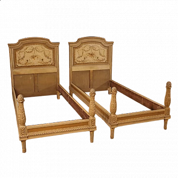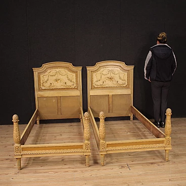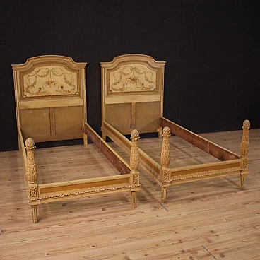 Coppia di letti italiani della metà del XX secolo. Mobili in legno scolpito, laccato e dipinto in stile Luigi XVI. Letti costituiti da quattro elementi lignei cadauno, completamente smontabili (testiera, pediera, sponde laterali), strutturalmente sani. Mobili in bella patina, riccamente adornati da decori floreali, con alcune piccole cadute di colore (vedi foto). Letti facenti parte di una camera completa di due comodini, un comó con specchiera e due poltroncine (vedi foto e richiedi il prezzo in blocco se disponibile). Mobili strutturalmente sani con piccoli segni del tempo. Nel complesso in buono stato conservativo. Misure interne L 85 x P 197 cm.