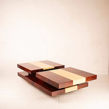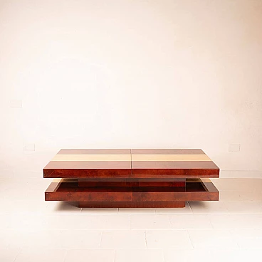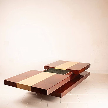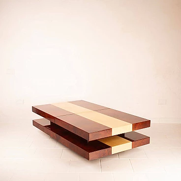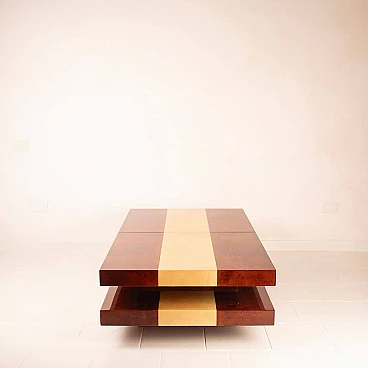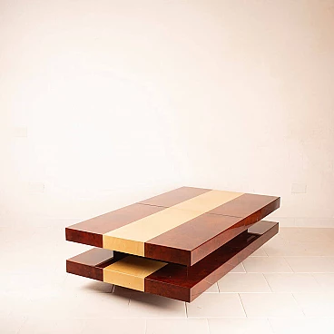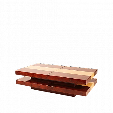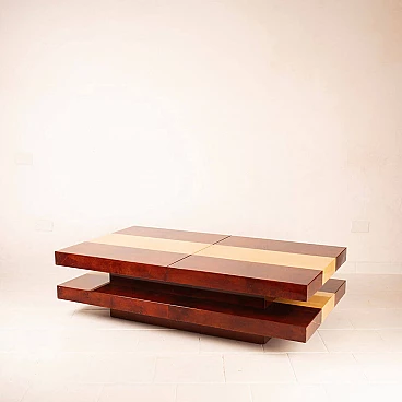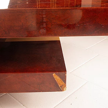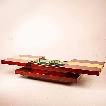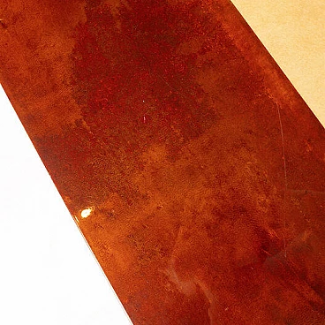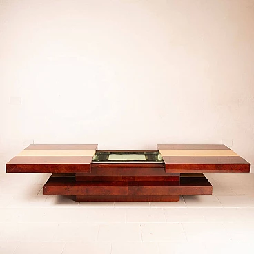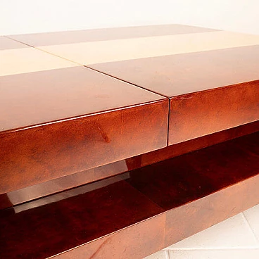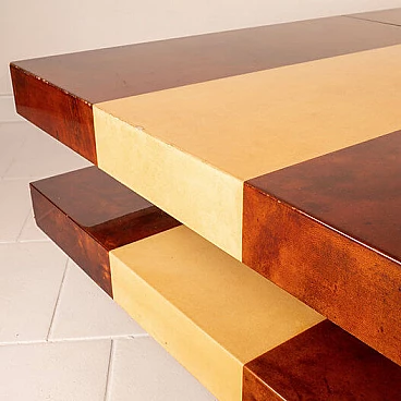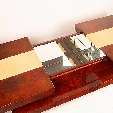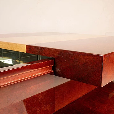 Scopri il nostro straordinario tavolino da salotto in pergamena, un autentico capolavoro di design degli anni '60 creato dall'acclamato artigiano e artista lombardo Aldo Tura. Questo tavolino si distingue per il suo imponente design, il cui piano scorrevole rivela un vano bar completamente specchiato, perfetto per le tue esigenze di intrattenimento. La bellezza di questo oggetto risiede nella combinazione di pergamene di due diverse tinture: la naturale e il color tabacco. Questa fusione di colori conferisce al tavolino un impatto estetico eccezionale. Inoltre, quando completamente aperto per accedere al vano bar, la sua lunghezza si estende fino a 240 cm, offrendo versatilità e funzionalità. Questo tavolino si trova in condizioni eccellenti, con l'eccezione di un piccolo angolo di 4 cm, come evidenziato nelle fotografie, che può essere facilmente restaurato, se lo si desidera. Le sue dimensioni lo rendono ideale per adattarsi a qualsiasi spazio e conferire un tocco di eleganza al tuo salotto. Scopri l'arte del design con il tavolino da salotto in pergamena di Aldo Tura e trasforma il tuo ambiente in uno spazio unico e sofisticato.