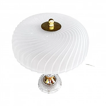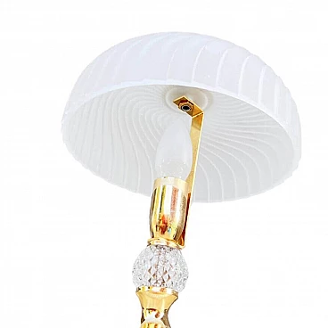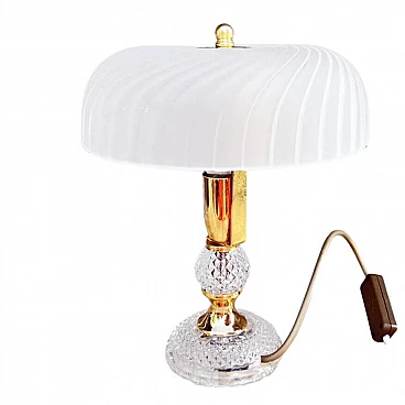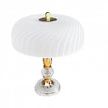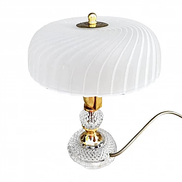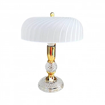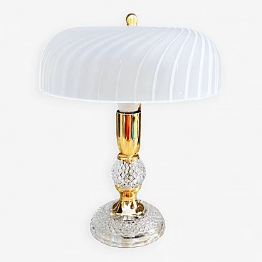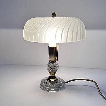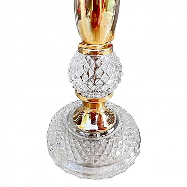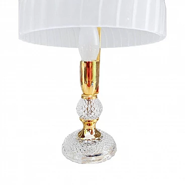Lampada da comodino in cristallo in stile Hollywood Regency, realizzata in Francia nella seconda metà del XX secolo. La base della lampada è una sfera di cristallo prodotta da Baccarat, rifinita in ottone, mentre il paralume è in vetro pressato. La lampada è in ottime condizioni originali, con una patina che copre le parti in ottone, non presenta nessun danno al vetro. L'articolo funziona con una singola lampadina e14 fino a 60w. Dimensioni: altezza 29 cm; diametro paralume 22 cm; diametro base 10 cm. Dimensioni in pollici: altezza 11,4 pollici; diametro paralume 8,7 pollici; diametro base 3,9 pollici.