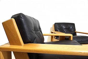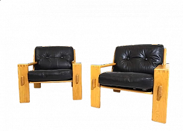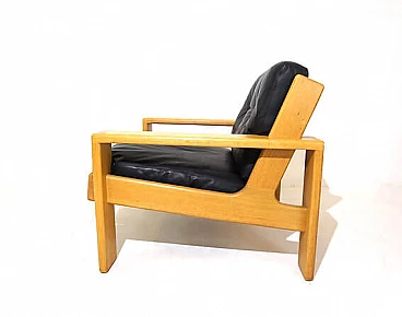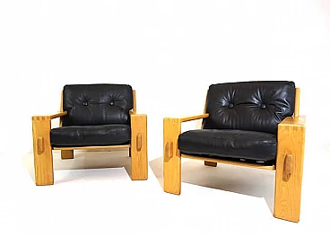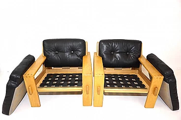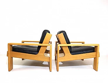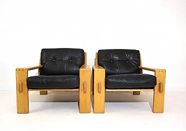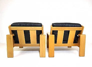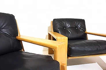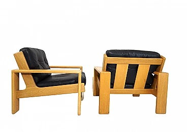 Coppia di poltrone Bonanza di Esko Pajamies per Asko, anni '60. Bellissima combinazione di pelle nera e struttura in legno chiaro. Le poltrone presentano minimi segni di usura della pelle, che è spessa, morbida ed elastica. Le strutture in legno sono in perfette condizioni. Le cinghie di rivestimento di entrambe le poltrone sono state sostituite per offrire un'esperienza di seduta ottimale. Altezza della seduta: 43 cm. Profondità della seduta: 52 cm.