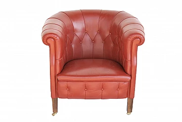 Poltrona capitonné Fumoir ripropone l'elegante poltrona introdotta nel catalogo degli anni venti. Si ispira alla poltroncina settecentesca a pozzetto con schienale basso, particolarmente adatta alla postura eretta. E' dotata di ruote anteriori in ottone e caratterizzata dalle cuciture a losanghe nello schienale. La struttura è in faggio stagionato. Il molleggio è realizzato con molle in acciaio legate a mano e appoggiate su cinghie di juta. L'imbottitura è in crine gommato. La tecnica costruttiva è la stessa del modello originale; la ricopertura è in pelle di vitello a pieno fiore. A tiratura limitata, questo è l' esemplare n. 995 Designer Renzo Frau