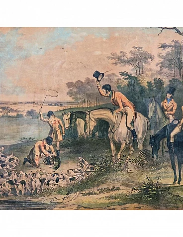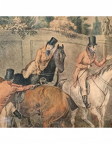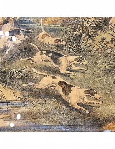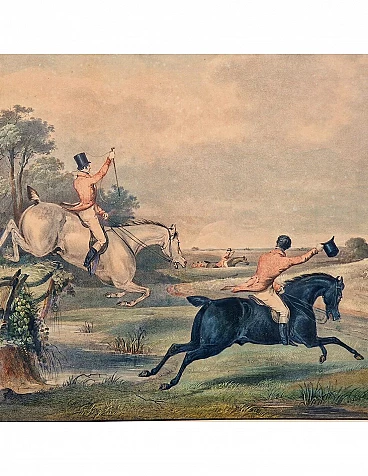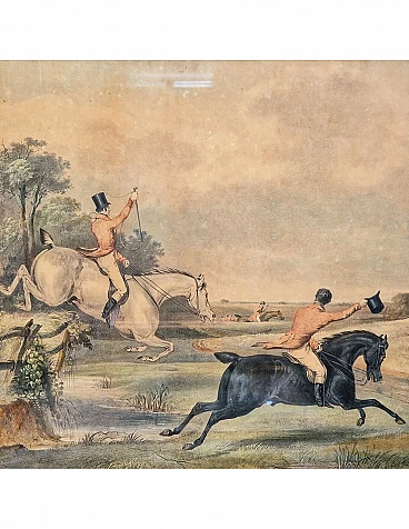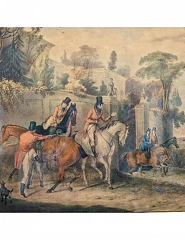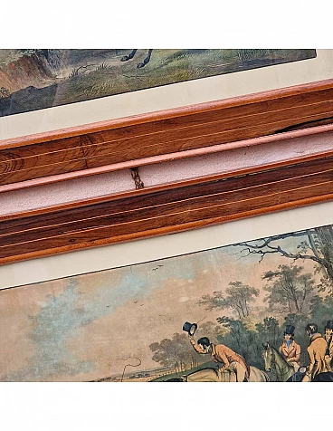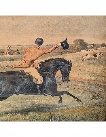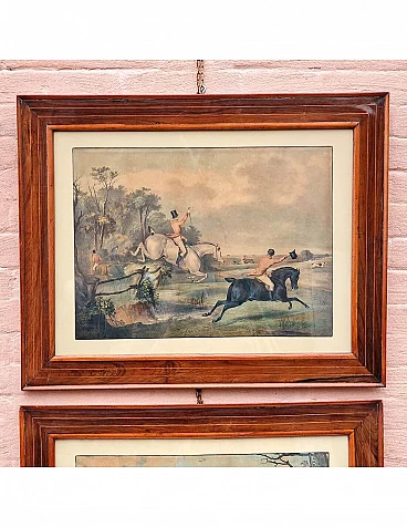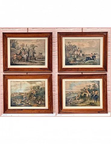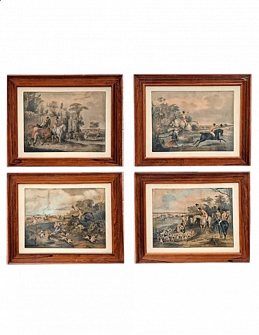 Set di quattro incisioni ad acquatinta con finissima coloritura coeva all'acquerello raffiguranti scene di caccia alla volpe, metà '800 circa.