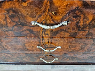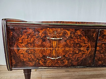 Cassettiera degli anni '50 con particolare piano in vetro lavorato effetto marmo. Mobile dal design moderno e lineare arricchito da piccoli bordi in ottone. Dotata di sette cassetti di cui quattro ampi e spaziosi e tre centrali più contenuti per piccoli oggetti o vestiti leggeri. È stata lucidata ma presenta comunque normali segni dovuti all'età e all'utilizzo.