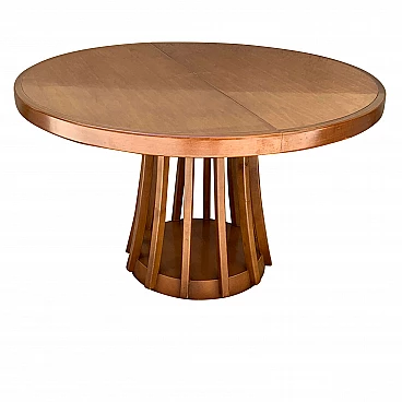 Tavolo allungabile in noce di Angelo Mangiarotti, disegnato nel 1972, prodotto da La Sorgente Dei Mobili. La base del piedistallo è costituita da un piede tondo, collegato a doghe che creano strutture aperte. Il risultato è un bel contrasto con il piano del tavolo di 120 cm di diametro. Il piano rotondo è allungabile e contiene un'anta a scomparsa nascosta sotto il piano che trasforma il tavolo in un ovale di 158 cm di lunghezza.