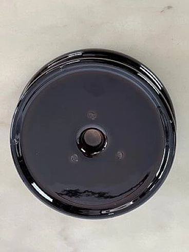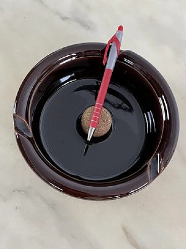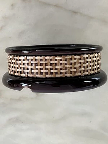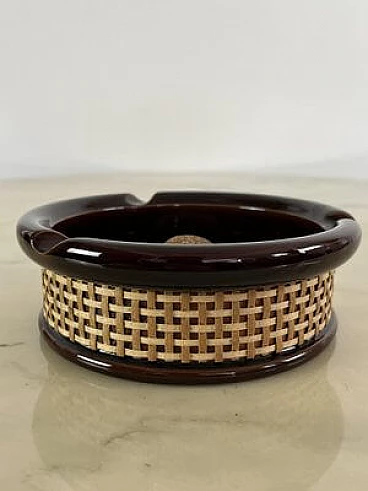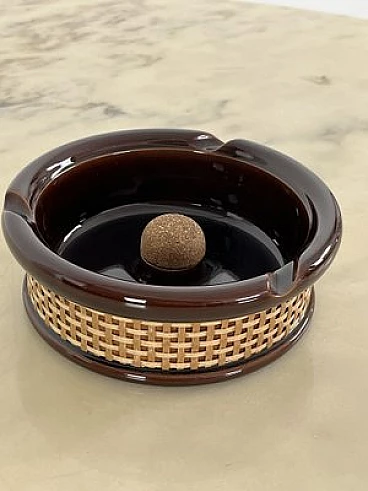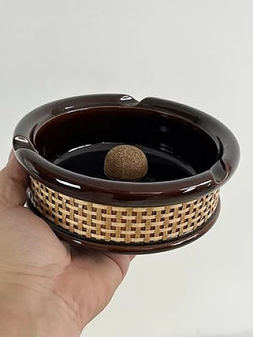 Particolare posacenere in ceramica smaltata, vimini e sughero. Risale agli anni '70. Condizioni molto buone. Piccoli segni del tempo.