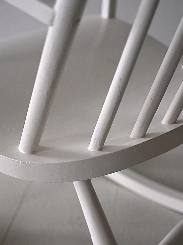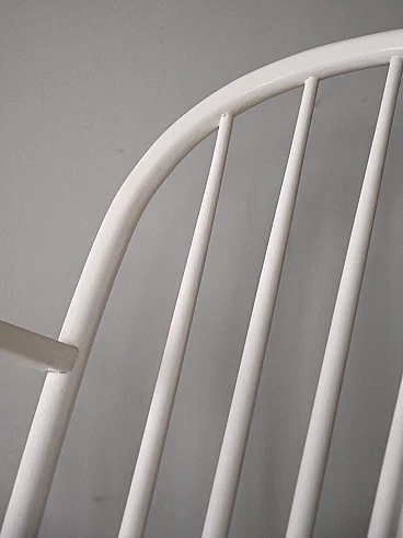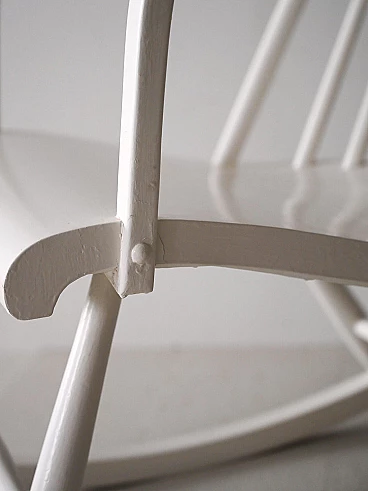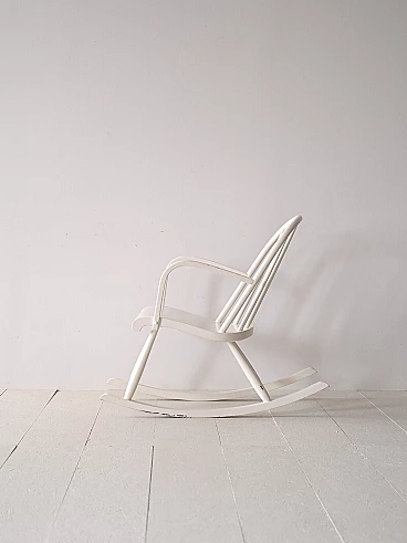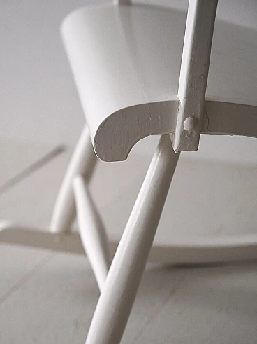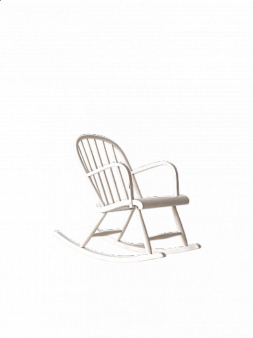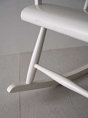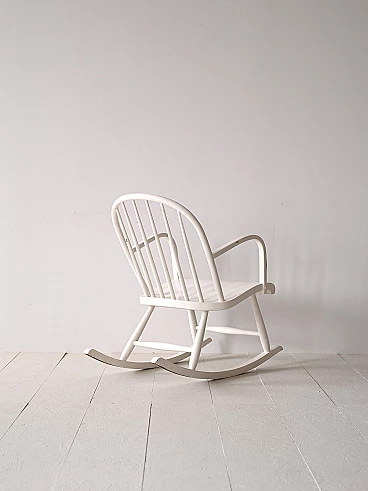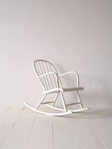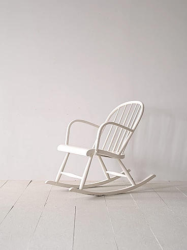 Sedia a dondolo scandinava in legno dipinto di bianco, anni '60-'70. Un pezzo d'arredo che rimanda alle forme tipiche delle classiche sedute scandinave in legno "Pinstolar". Oltre allo schienale, costituito da fusti in legno, sono presenti la seduta dai bordi arrotondati e le gambe di forma conica. Il colore chiaro e le linee morbide fanno di questa sedia un oggetto ideale per creare un ambiente rilassato in perfetto stile Hygge. È stato fatto un restauro conservativo. Potrebbe presentare segni del tempo.