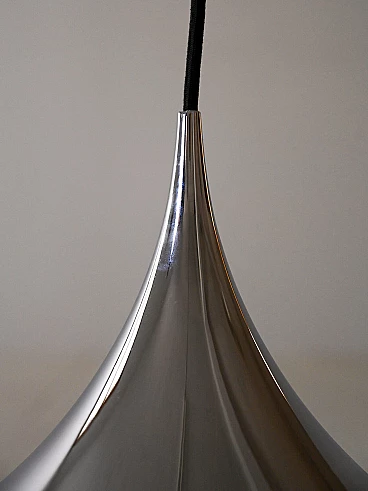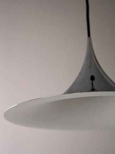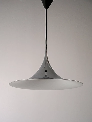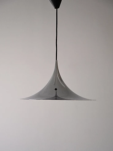 Lampada a sospensione Semi in metallo argentato di Bonderup & Thorsten, anni '70. Un oggetto divenuto un'icona globale grazie al suo stile classico e senza tempo. Il prodotto fu presentato per un concorso all'Accademia Reale di Belle Arti danese e alla Scuola di Architettura dove vinse il primo premio. La forma elegante e minimale del paralume in metallo crea una luce diffusa a forma di cono, ideale su un tavolo da pranzo o in cucina. La sua forma leggera è ideale per qualsiasi tipo di arredamento. Potrebbe presentare segni del tempo. Per piacere prestare attenzione alle fotografie.