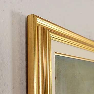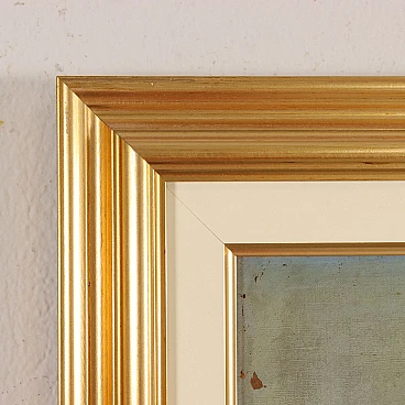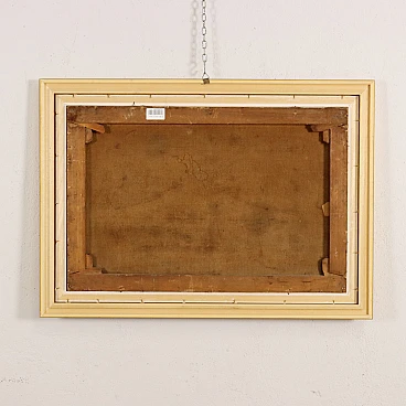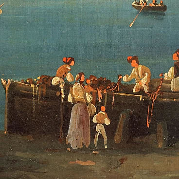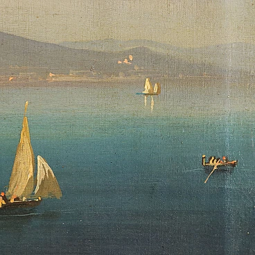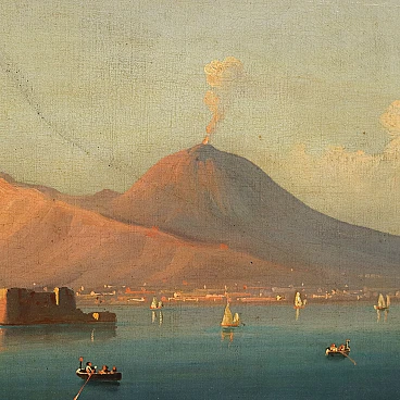 Dipinto a olio su tela di scuola napoletana raffigurante una veduta del Golfo di Napoli e del Vesuvio, '800. Tipico esempio di pittura da Grand Tour, il dipinto propone uno scorcio del Golfo di Napoli animato da numerose imbarcazioni, di cui in primo piano una di pescatori che approda sulla spiaggia, ove attendono le mogli e i figli; sullo sfondo campeggia il Vesuvio fumante. La scena risulta vivace per la vitalità che esprime e per i colori, sebbene le sfumature rosate del cielo e del Vesuvio richiamino la nota romantica propria della pittura dell'epoca. La tela presenta piccole cadute di colore. Completo di cornice in stile. Misure senza cornice: 50 x 76 cm.