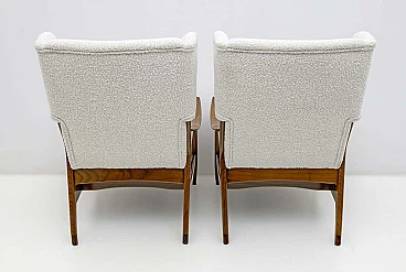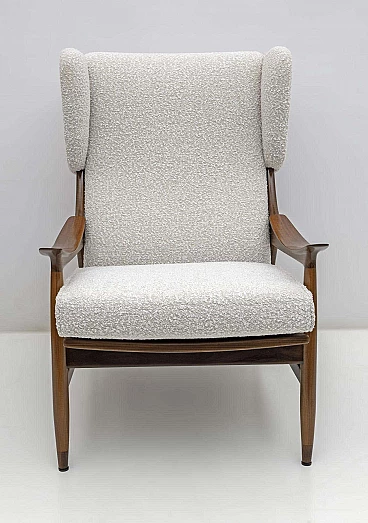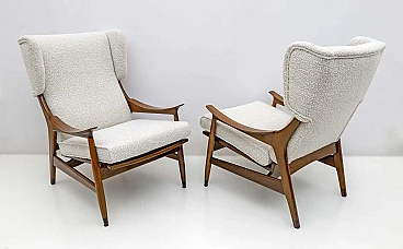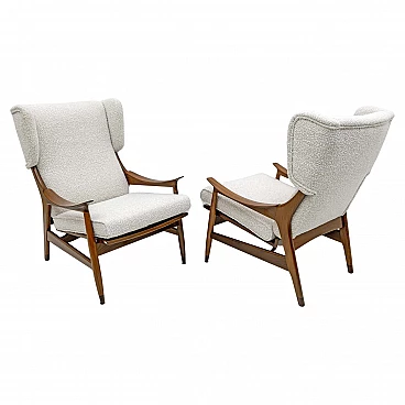 Prodotta in Italia negli anni '50 dall'azienda Framar (Fratelli Marelli), questa coppia di sedie da salotto è spettacolare! Con la sua struttura leggera in legno di teak, il piano d'appoggio ad ala e i braccioli a sbalzo, queste sedie lounge rappresentano il meglio dell'elegante design italiano moderno. Rivestite in pregiato bouclé, queste poltrone lounge sono comode e belle allo stesso tempo. Perfette per uno studio, un camino, un angolo lettura o un salotto, queste poltrone chiedono semplicemente di sedersi. Queste poltrone sono state completamente restaurate e rivestite, pronte per arredare la tua casa.