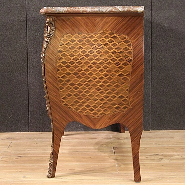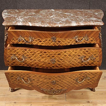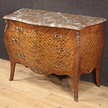 Cassettone francese stile Luigi XV in legno intarsiato con piano in marmo