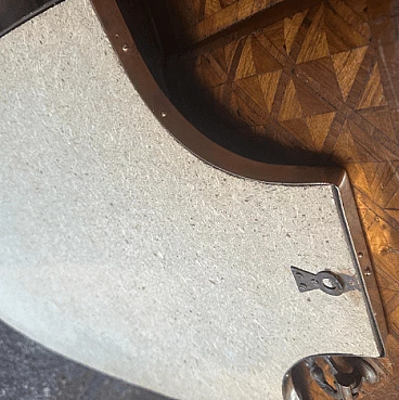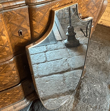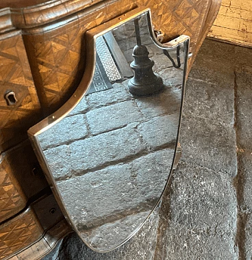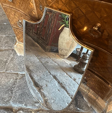 Specchio da parete a forma di scudo con cornice in ottone massiccio nello stile di Gio Ponti, anni '50. Ponti utilizzava questo tipo di specchio nelle più belle case milanesi degli anni '50. L'ottone ha una bella patina, il vetro è quello originale. La forma a scudo era un segno distintivo degli specchi disegnati da Ponti. Questo specchio è uno splendido pezzo di design vintage che incarna l'essenza dell'estetica della metà del secolo scorso; mette in mostra il suo caratteristico mix di funzionalità, eleganza e influenze moderniste. Lo specchio ha una presenza audace e accattivante, che lo rende un punto focale in qualsiasi stanza. La forma a scudo ricorda gli scudi delle antiche armature, aggiungendo un tocco di riferimento storico al design. La cornice dello specchio è realizzata in ottone, un materiale molto diffuso a metà del secolo scorso. La calda tonalità dorata dell'ottone completa la superficie riflettente dello specchio, creando un effetto visivo armonioso. La struttura in ottone è elegante e minimalista, con linee pulite e una finitura liscia, che mette in mostra la semplicità e la raffinatezza del design moderno di metà secolo. Lo specchio stesso è di grandi dimensioni e consente di riflettersi e di fungere da elemento funzionale e decorativo nella stanza. La superficie riflettente è chiara e senza fronzoli, per enfatizzare lo scopo dello specchio e migliorare l'illusione di spazio e luce nell'area circostante. Questo specchio racchiude lo spirito del design degli anni '50. La sua combinazione di forme organiche e geometriche, insieme all'uso di materiali di alta qualità, esemplifica l'impegno dell'epoca sia per la forma che per la funzione.