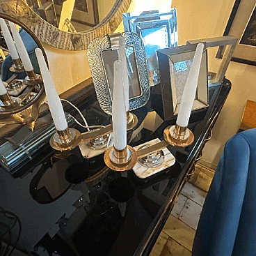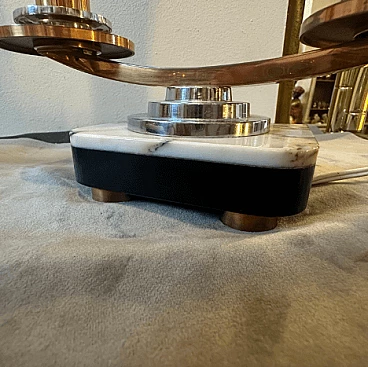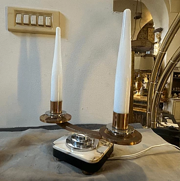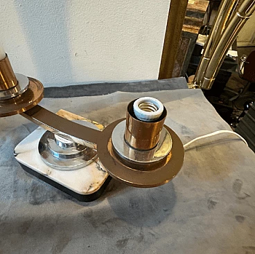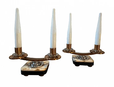 Coppia di lampade da tavolo Art Déco francesi a due luci in marmo, rame, acciaio e vetro, anni '30. Sono funzionanti e necessitano di normali lampadine E14. L'Art Déco è stato uno stile di design influente negli anni '20 e '30, noto per le sue forme geometriche audaci, i materiali ricchi e l'estetica lussuosa. Queste lampade sembrano incorporare diversi elementi chiave del design Art Déco. Il rame e l'acciaio erano metalli comunemente utilizzati nel design Art Déco; la loro combinazione crea un contrasto di colore e consistenza, generando interesse visivo. L'uso del marmo rosa aggiunge un tocco di lusso e raffinatezza; il marmo era uno dei materiali preferiti dal design Art Déco e la tonalità rosa aggiunge un tocco morbido e femminile alle lampade. Il vetro opalino, che ha un aspetto lattiginoso e opaco, diffonde la luce in modo meraviglioso e ha una qualità eterea. Il design Art Déco si caratterizza per le sue forme geometriche, snelle e moderne che si allontanavano dagli stili ornati del passato. Il design Art Déco francese è particolarmente rinomato per la sua eleganza e attenzione ai dettagli, rendendone gli oggetti più desiderabili per i collezionisti e/o gli appassionati dello stile. Queste lampade possono essere usate sia come illuminazione funzionale che come elementi decorativi.