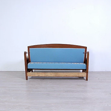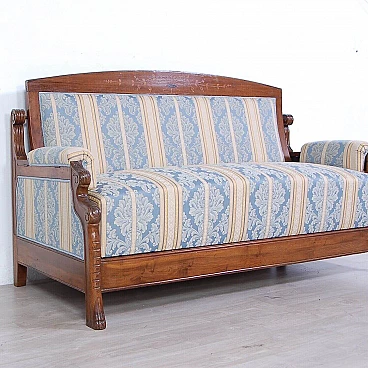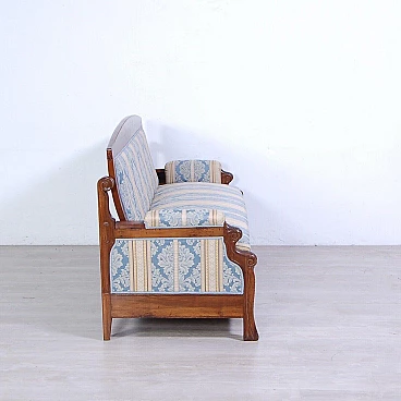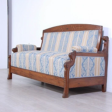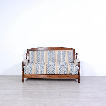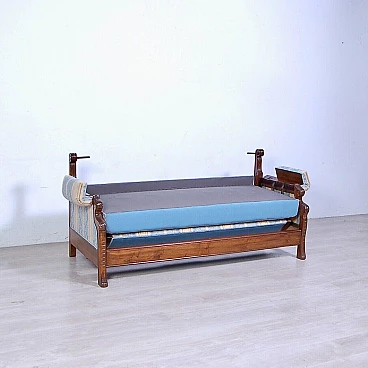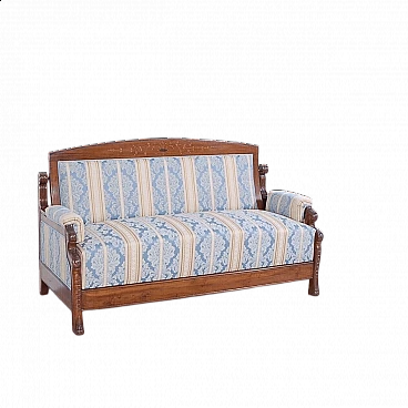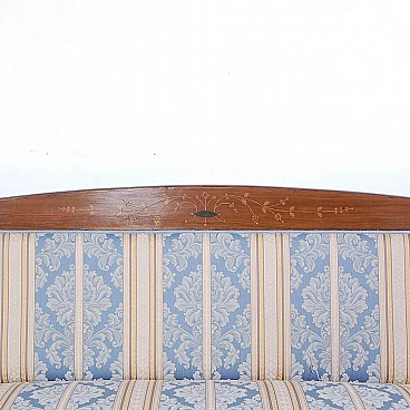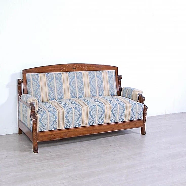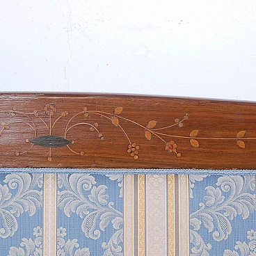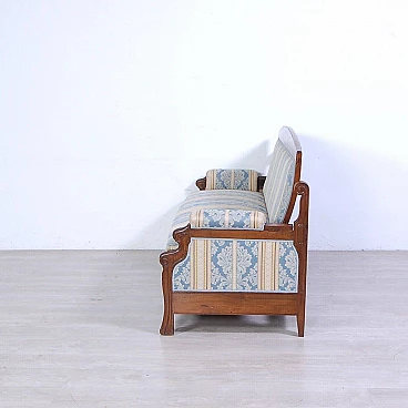 Divano letto ribaltabile Liberty in noce con intarsi, inizio '900. Struttura solida in legno di noce. Predisposto all'utilizzo come letto ribaltando la seduta. A oggi il divano è stato restaurato ripristinando le molle e il rivestimento: con questo intervento si è andati a "escludere" l'uso come letto singolo; la parte sotto è rifinita a chiusura e non come parte da mostrare e valorizzare (vedi foto). Presenta una lieve macchia frontale sulla stoffa, facilmente removibile (vedi foto). Nella parte lignea superiore sono presenti intarsi ben realizzati. Questo divano è rimasto nel classico salotto della nonna, da guardare ma non da utilizzare ed è quindi in condizioni davvero buone. Altezza della seduta: 53 cm.