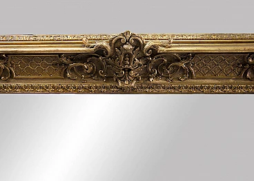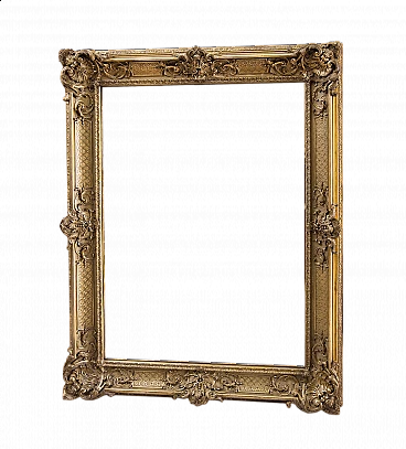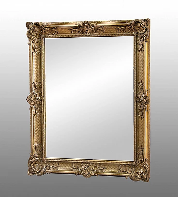 Specchiera in legno dorato e intagliato Napoleone III francese della seconda metà del XIX secolo. Il bordo riccamente intagliato è caratterizzato da quattro angoli a forma di conchiglia con al centro sempre un intaglio a motivo fogliaceo. Nel mezzo tra i due intagli a rilievo vi è un'altro intaglio a motivo geometrico che arricchisce ulteriormente la cornice. Specchio non coevo. Provenienza Francia (1860/70). Misure: 160x122cm. Buono Stato. Certificato di Autenticità.