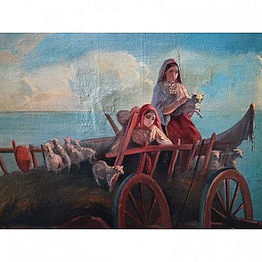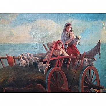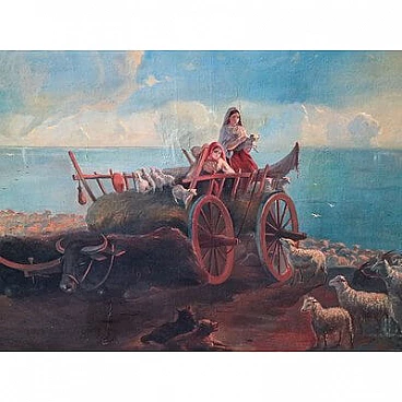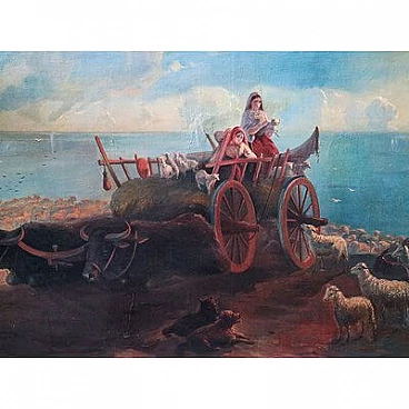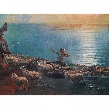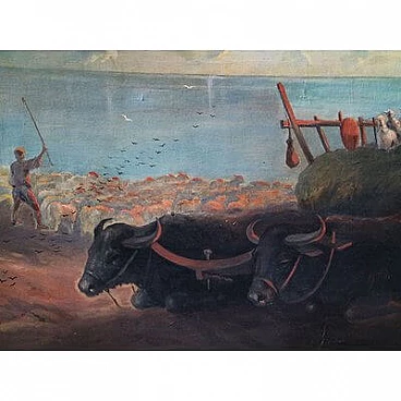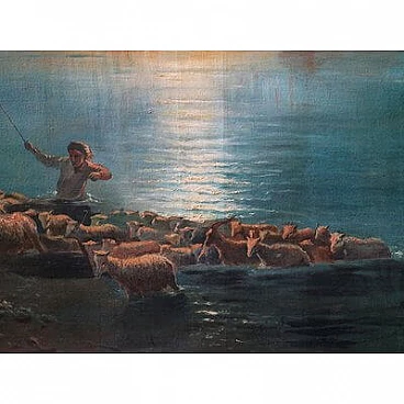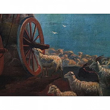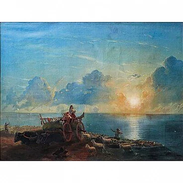 Tramonto con animali e personaggi, dipinto a olio su tela, '800