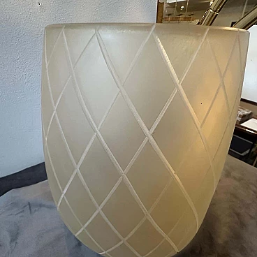 Un vaso disegnato e prodotto a Murano negli anni Cinquanta alla maniera di Barovier: l'oro all'interno del vetro satinato crea un effetto superbo. Il vaso è in perfette condizioni. Questo vaso esemplifica l'eleganza e la maestria che caratterizzano il vetro di Murano. Il vetro di Murano di alta qualità è rinomato per la sua chiarezza, purezza e brillantezza. Il vetro di Murano è noto per la sua eccezionale maestria e da secoli è simbolo di lusso. Il vetro trasparente funge da materiale di base, mentre il vetro dorato o gli accenti sono incorporati nella decorazione che ricorda una recinzione. L'oro aggiunge un tocco di opulenza al pezzo. Il vaso ha una forma ovale semplice ed elegante con un design equilibrato e ben proporzionato. Pur essendo principalmente un pezzo decorativo, il vaso può essere utilizzato per contenere fiori o come opera d'arte a sé stante. Il suo design chiaro e dorato lo rende un pezzo forte in qualsiasi ambiente interno.