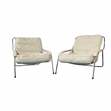 Set di 2 poltrone 'Maggiolina' disegnate da Marco Zanuso per Zanotta, nel 1947. Struttura in acciaio inox 18/8 lucidato. Scocca in cuoio pigmentato 90. Imbottitura cuscino schienale in piuma d’oca. Imbottitura cuscino seduta in poliuretano/ Dacron Du Pont. Rivestimento, cuscini e braccioli in pelle. L'oggetto di presenta in buone condizioni, con qualche segno del tempo, come ad esempio macchie, visibili in foto.