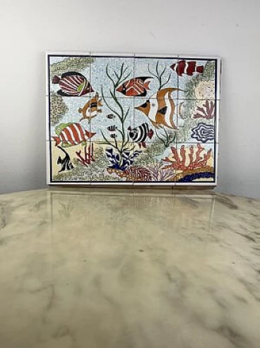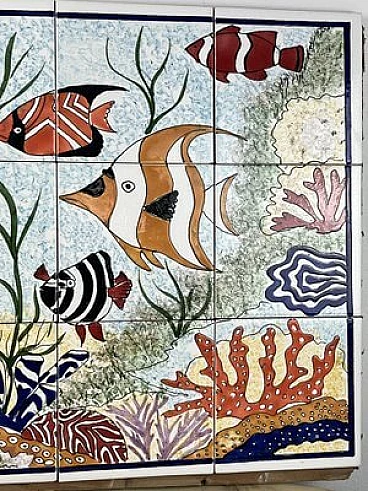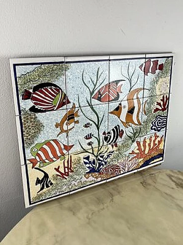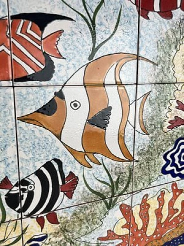Pannello in ceramica decorata a mano con pesci, anni '80