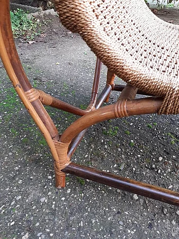 Poltrona con poggiapiedi in malacca e corda intrecciata con struttura in legno, anni '50