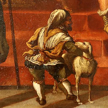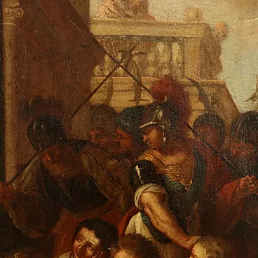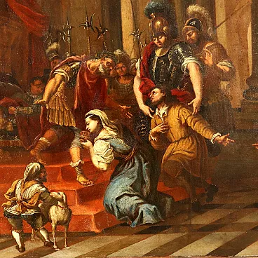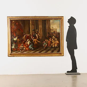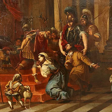 Dipinto a olio su tela di scuola dell'Italia meridionale del '600-'700. La scena, ricca di personaggi, vede ergersi al centro, ben definito nei particolari dell'armatura, del cimiero, così come dell'anatomia, la figura di un condottiero; egli sta benevolmente accompagnando con il moto delle braccia un uomo inginocchiato che, insieme alla compagna, sta rendendo omaggio a un imperatore, indicando però con la mano tesa il gruppo di sei fanciulli, trattenuti sulla destra dai soldati. L'imperatore si è alzato dal trono, sulla sinistra, e si reca incontro alla coppia prostrata, ma anch'egli pare quasi in atteggiamento di riverenza verso il condottiero centrale. La scena pare rimandare a un episodio storico di clemenza di un condottiero, che per età, fattezze e tipologia di armatura, potrebbe essere Alessandro Magno, personaggio che risulta però difficilmente abbinabile all'altra figura coronata da alloro, che scende dal trono nella fastosa reggia. Non si può quindi identificare specificamente l'episodio (storico o leggenda?) di riferimento; potrebbe essere l'incontro della famiglia di Dario con Alessandro Magno. Si apprezza la ricchezza compositiva della scena, con numerose figure ben dettagliate e colori vivaci a sottolinearne la dinamicità.