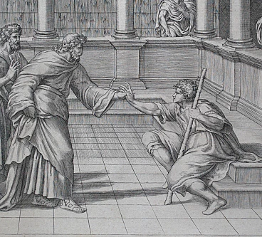 Secondo Bartsch e Passavant il soggetto deriverebbe da un’invenzione di Perin del Vaga riconoscibile in particolar modo nella figura del cieco che ricorda lo stile dell’artista durante il periodo in cui era attivo nella bottega di Raffaello. Viene rappresentata una scena del Nuovo Testamento (Giovanni 9:1-9). Al centro della scena Cristo seguito da un gruppo di uomini, è un uomo barbuto visto di profilo, dai lunghi capelli e vestito con tunica e sandali, è colto nell’atto di tendere la mano ad un giovane ragazzo cieco, anche lui di profilo, seduto su dei gradini di fronte a lui. La scena si svolge all’interno di un cortile marmoreo delimitato da un loggiato. Il cieco con la mano sinistra afferra un bastone e tende la destra ad afferrare la mano di Cristo. Sulla sinistra in alto si apre un piccolo brano di paesaggio: un grande albero dalle rigogliose fronde e delle abitazioni con una torre.