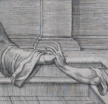 Per formato e per la tipologia delle figure la stampa ricorda il Cristo nella casa di Simone (TIB 26) di Marcantonio Raimondi che Mariette riconosce derivare da un ciclo di affreschi di Giulio Romani e Giovanni Francesco Penni in S. Trinità dei Monti a Roma risalenti al 1520 circa.
