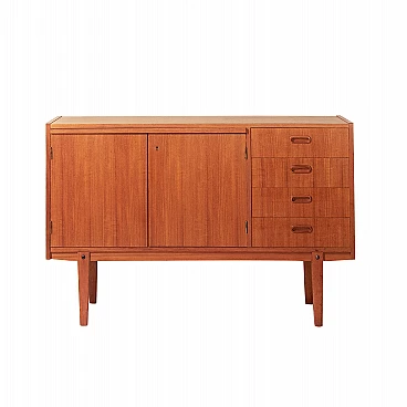 Sideboard svedese in Teak con piano estraibile. Questo mobile dalla doppia funzione presenta le linee tipiche scandinave del design di metà secolo. Il piano superiore caratterizzato dalle marcate venature del legno teak nasconde un ripiano estraibile che trasforma questa credenza in una comoda scrivania per studiare o lavorare al pc. La parte destra del mobile è composta da quattro capienti cassetti con l’impugnatura scolpita in legno e da due ante dotate di serratura che nascondono un grande vano, ideale per mantenere l’ordine in casa! Il mobile termina con le gambe rastremane in legno massello, la cui particolarità consiste nelle due viti nere in vista che contribuiscono a dare carattere al mobile. Grazie alle sue dimensioni compatte ed alla sua multifunzionalità il sideboard è perfetto per essere inserito in ogni ambiente della casa, all’ingresso, in soggiorno o in camera da letto.