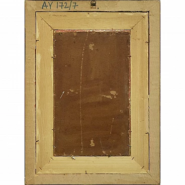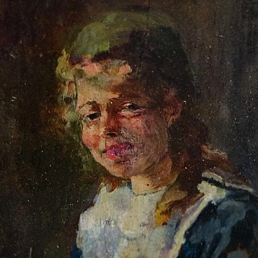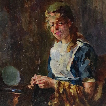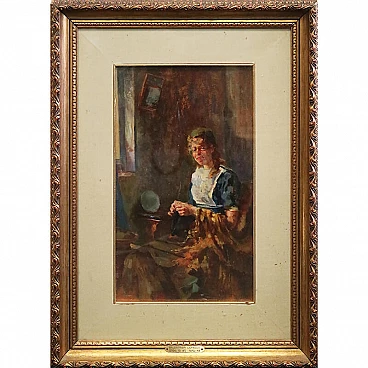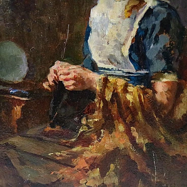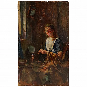 Lionello Balestrieri, ragazza che cuce, dipinto a olio su tavola di cartone, anni '20