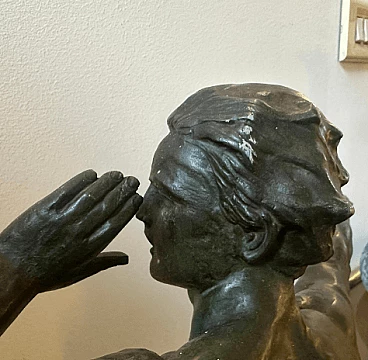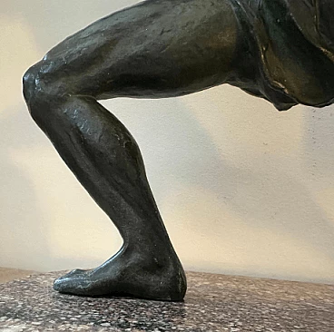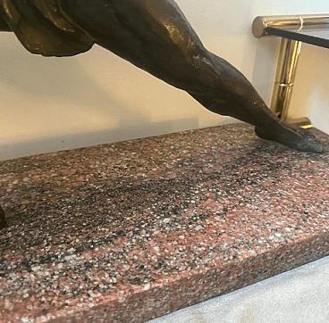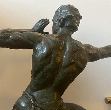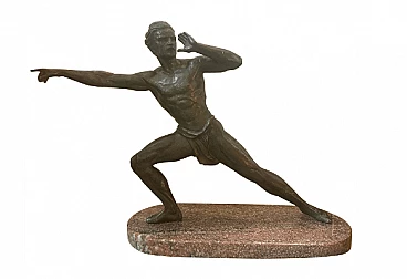 Scultura Art Déco in antimonio e marmo di Jean de Roncourt raffigurante un atleta, anni '30. Il soggetto è un uomo o atleta molto muscoloso che invita altri a osservare ciò che sta indicando. L'opera è realizzata in metallo antimonio con patina verde su una base di marmo. Jean de Roncourt è un artista francese noto per le sue grandi sculture di uomini muscolosi o atleti che praticano sport. L'artigianato prevede una resa dettagliata dei muscoli e della forma fisica, enfatizzando l'atletismo del soggetto. L'uso del marmo per la base contribuisce all'estetica generale, fornendo stabilità e completando la scultura.