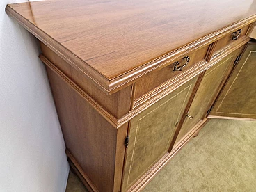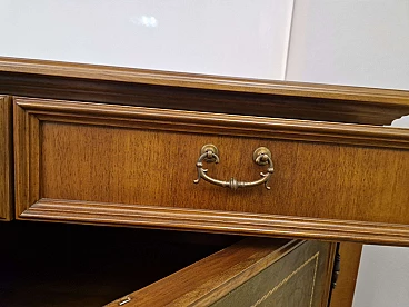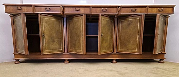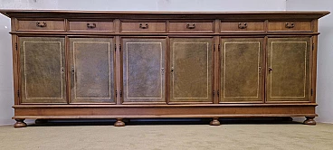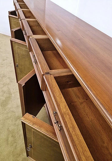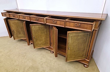 Credenza stile fiorentino, anni '60-'70. Splendida credenza bassa a sei ante realizzata in pregiata essenza di noce nazionale sia all'esterno che all'interno. Le ante sono impreziosite da tableaux in vera pelle color verde oliva con doppio bordino perimetrale inciso, di cui uno in oro. La pelle verde oliva presenta marezzature più chiare su tonalità avana. All'interno di ciascuna delle tre coppie di ante trova posto un ripiano in noce. Sopra le sei ante si collocano sei cassetti in noce con cornice perimetrale in rilievo. Il piano è aggettante e sostenuto da modanature, mentre il basamento è sostenuto da otto piedi in massello di noce a cipolla. Le maniglie e la ferramenta sono in ottone brunito. Realizzata artigianalmente in Brianza; costruzione tradizionale con legno massello e tamburato. Prodotto da esposizione in ottime condizioni salvo qualche lieve segno del tempo, pur non essendo mai stato usato; il piano della credenza è in ottime condizioni, presenta solo un piccolo segno sulla lucidatura.
