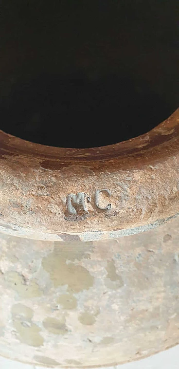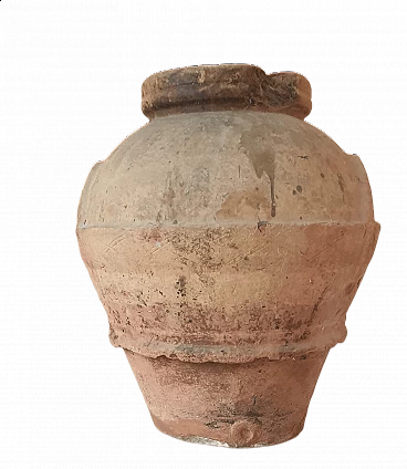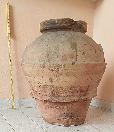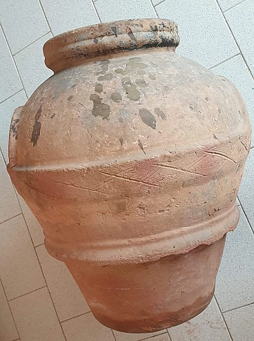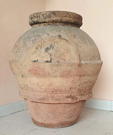 Orcio in terracotta per la conservazione dell'olio, '700. Ben conservato, con una mancanza sull'orlo, dove è presente il timbro impresso MC, forse da riferirsi alla fornace di produzione. Decorato da una fascia continua con motivo a X, ha i manici in rilievo e, alla base, un cordolo a sbalzo che ne garantiva l'impilaggio per il trasporto. Buone condizioni generali con qualche brunitura dovuta al tempo e qualche mancanza sull'orlo così come si può vedere dalle foto, che sono da considerarsi parte integrante della descrizione. Diametro dell'orlo: 29 cm. Circonferenza massima della pancia: 160 cm.