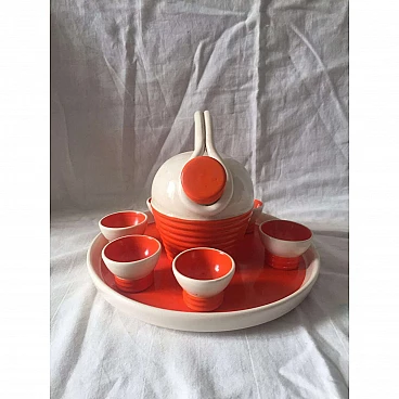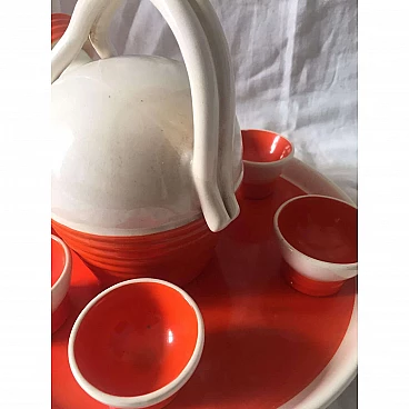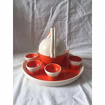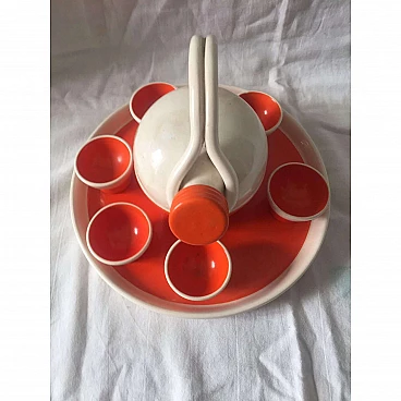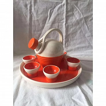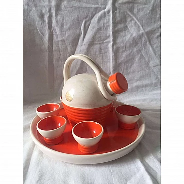 Ottime condizioni per questo servizio da liquore in ceramica con sei bicchieri, caraffa e vassoio. Prodotto in Italia negli anni '60 da Rometti. Dimensioni della caraffa: h: 6,7, d: 6, l: 4 (pollici). Firmata sul fondo. Questo servizio da liquore è l'articolo ideale per creare un momento perfetto per il vostro spazio preferito e per la vostra casa.