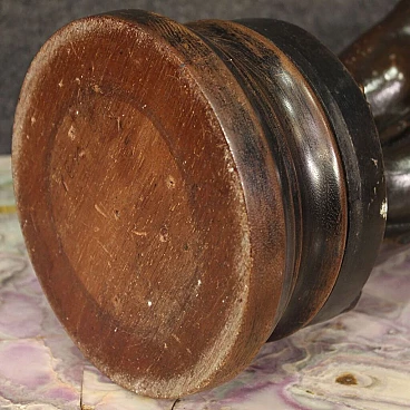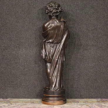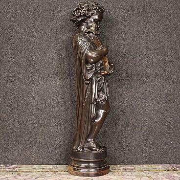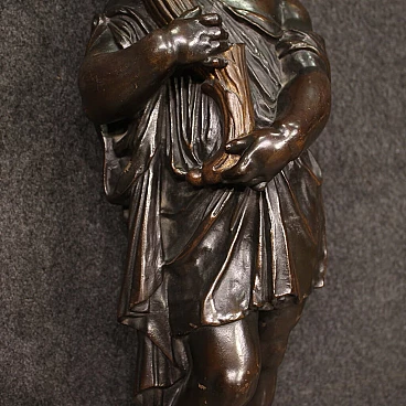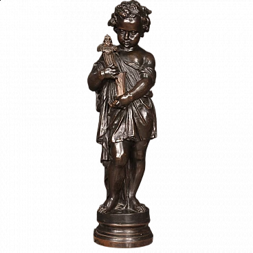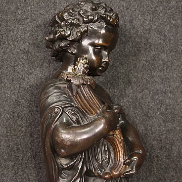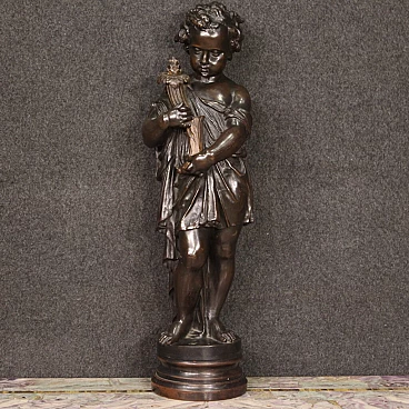 Scultura francese della prima metà del XX secolo. Opera in metallo patinato, tinta bronzo, montato su basamento ligneo raffigurante putto con cornucopia, di bella decorazione e qualità. Scultura finita da centro, di buona misura, piacevolmente cesellata, da notare la bella veste e i boccoli del putto (vedi foto). Raffinato il fanciullino che sorregge la cornucopia, simbolo dell'abbondanza. Opera dal peso considerevole, ideale da esporre in un salotto o studio. Presenta piccoli segni di usura che donano ancor più fascino all'oggetto. In buone condizioni.