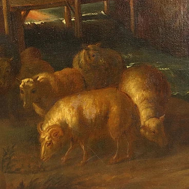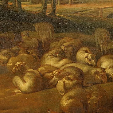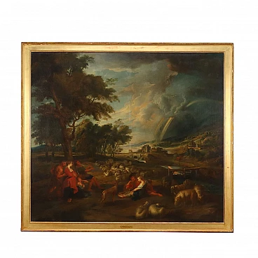 Dipinto a olio su tela del '700 raffigurante un paesaggio con arcobaleno; si tratta di una copia dal celebre dipinto di Peter Paul Rubens, realizzato tra il 1632 e il 1635, attualmente conservato al Museo dell'Hermitage. La grande scena pastorale presenta un ampio scorcio paesaggistico che spinge lo sguardo fino alla lontana costa marittima; su di esso il cielo si sta progressivamente aprendo lasciando intravvedere sprazzi d'azzurro sulla sinistra, mentre sulla destra, tra le nubi più scure residue dal temporale, si rivela un grande arcobaleno. In primo piano, un gruppo di pastori e pastorelle si diletta in giochi amorosi, discinti e festosi, in mezzo ai loro armenti, che si riposano e si abbeverano al vicino ruscello. Tutta la scena è animata da una dimensione di gioioso relax e ristoro, come se l'arcobaleno avesse ridonato serenità all'ambiente, riportando la luce e con essa la serenità nel mondo. Rispetto al dipinto di Rubens, sono cambiati qui alcuni elementi, in particolare l'arcobaleno che risulta qui spostato a destra anziché essere centrale; le dimensioni inoltre sono maggiori di quelle dell'opera originale. Sulla cornice è riportata un'etichetta attributiva a Jacob Joardens, pittore fiammingo che fu seguace di Rubens, ma l'attribuzione non è convalidata.