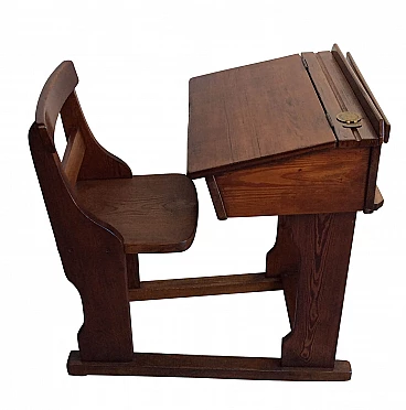Banco scuola inglese in legno di larice dei primi anni del XX sec. Tutto originale, presenta ancora il calamaio in ceramica chiuso da un coperchio di bronzo. Il piano inclinato cela un vano e nella parte posteriore è presente il porta quaderni. Tutto il piano scorre su dei binari e permette di avere più spazio per una seduta comoda. Condizioni: a causa dell'età e dell'uso presenta piccoli segni di usura.