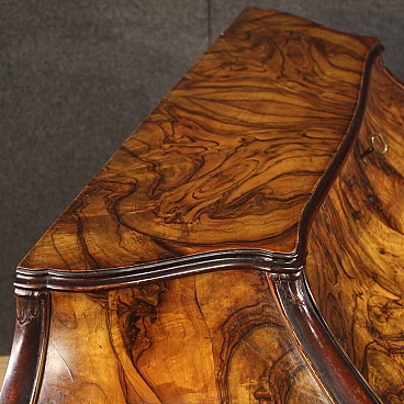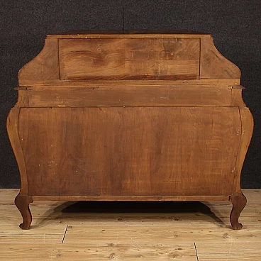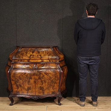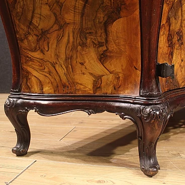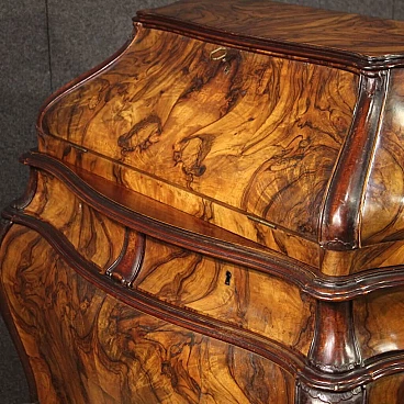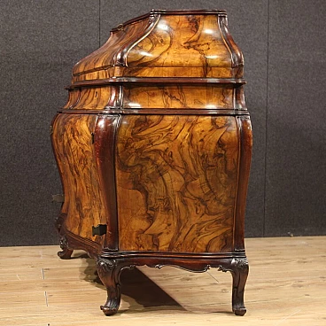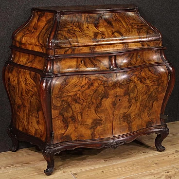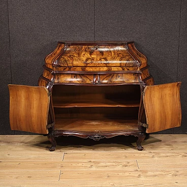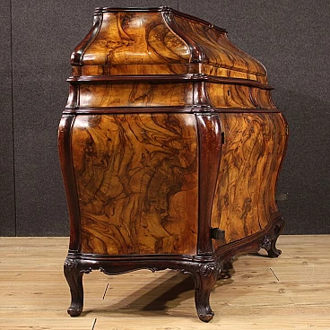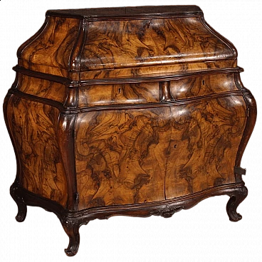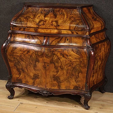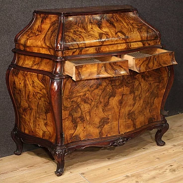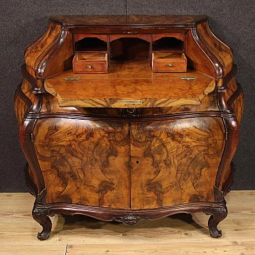 Ribalta lombarda della metà del XX secolo. Mobile a urna, mosso e bombato, scolpito e impiallacciato in legni di noce, radica e faggio di bella linea e piacevole arredamento. Credenza a due ante di buona capacità munita internamente di un ripiano fisso più piano a basamento. Sopra le ante due comodi cassetti e la calatoia che offre al suo interno un piano scrittoio di misura contenuta, due cassettini e tre piccoli vani porta documenti (vedi foto). Credenza da salone e salotto, di bella proporzione e patina, sostenuta da quattro solide gambe con piedini a ricciolo. Completa di una chiave funzionante, si presenta in buono stato conservativo.