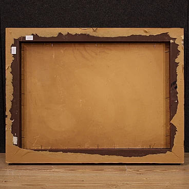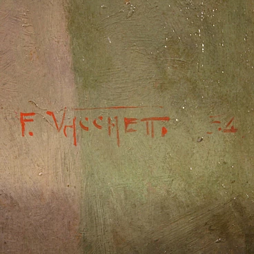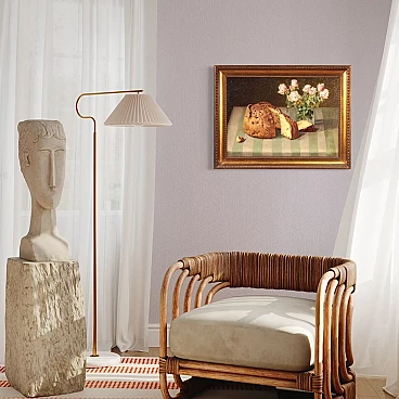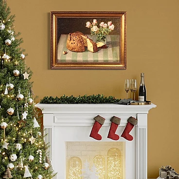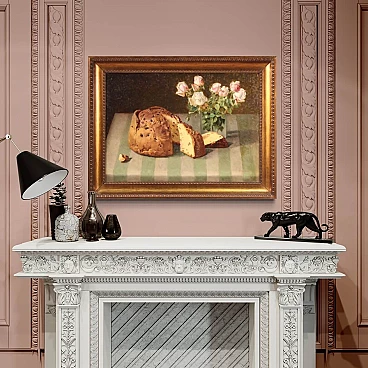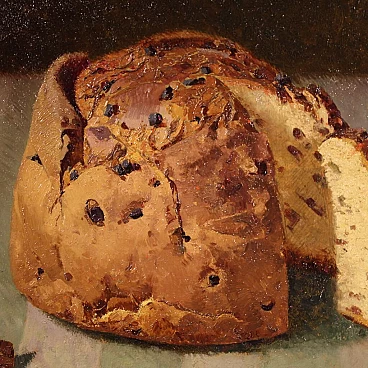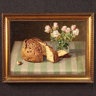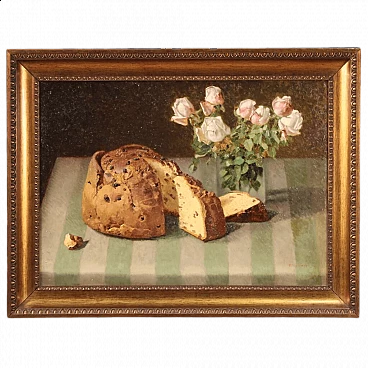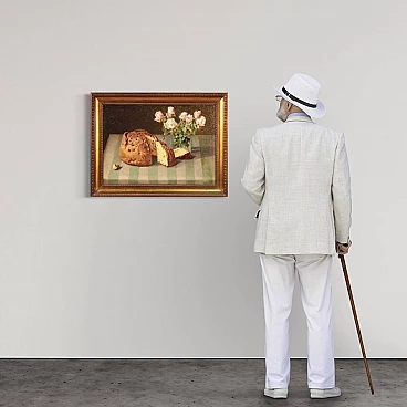 Dipinto italiano datato 1934. Opera olio su cartone raffigurante splendida natura morta, Tavolo con fiori e panettone di ottima mano pittorica. Cornice non coeva, della seconda metà del XX secolo, scolpita e dorata (tinta bronzo) di bella decorazione. Opera che è stata conservata in maniera ottimale dai precedenti proprietari, non presenta segni di usura e difetti normalmente riscontrabili in un dipinto della prima metà del Novecento. Dipinto di strepitosa luminosità, caratterizzato da colori ancora brillanti. Rifinito nei minimi particolari, da notare la maestria del pittore nel rappresentare il panettone con uvetta e canditi (vedi foto). Quadro per antiquari, arredatori e collezionisti di pittura italiana del XX secolo, firmato F. Vacchetti e datato 1934 (vedi foto) riferibile al pittore Filippo Vacchetti (1873-1945), mancante di autentica. In ottime condizioni. Luce dipinto H 49 x L 69 cm.