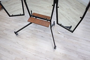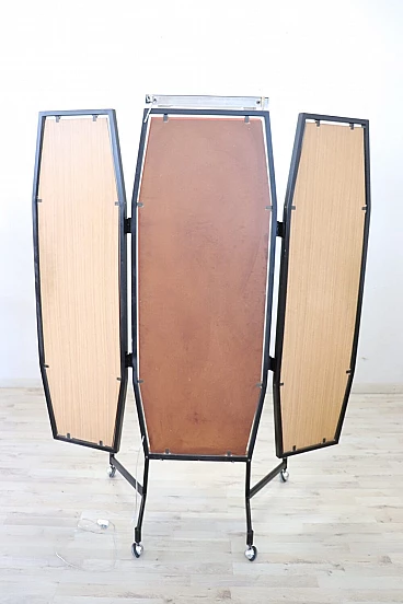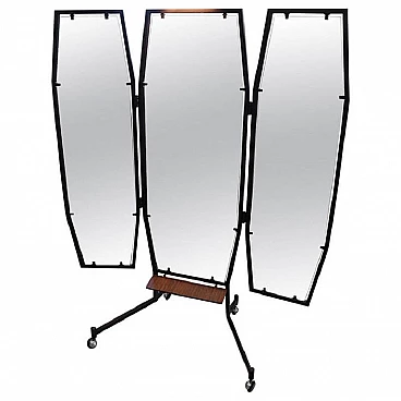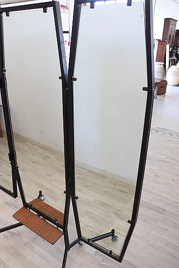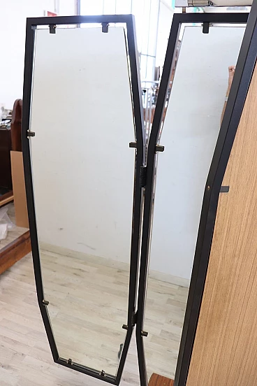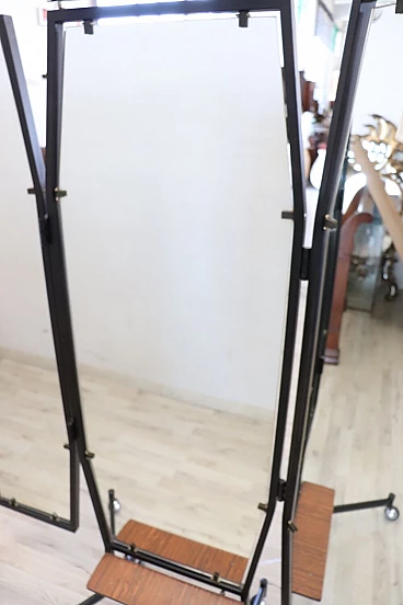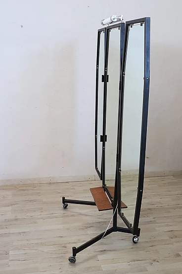 Specchio a figura intera con luce, della metà del secolo scorso. Formato da tre pannelli che si possono chiudere. La struttura è in ferro laccato nero. Ai piedi è dotato di ruote che ne consentono un pratico spostamento. Questo tipo di specchio veniva utilizzato nelle sartorie dove gli abiti venivano confezionati a mano. Una vera rarità perfetto per abbellire una camera da letto o un negozio di abbigliamento. Lo specchio può essere chiuso per occupare meno spazio nella stanza; la lunghezza da chiuso è di 95 cm. Proposto ad un ottimo prezzo trattabile, vi invitiamo ad inviarci le vostre proposte di acquisto, le valuteremo con piacere. Vi consigliamo comunque di guardare bene in dettaglio tutte le foto allegate. Aperto: larghezza 145 cm, profondità 65 cm, altezza 183 cm. Imballo professionale, spedizioni assicurate con corrieri, consegna su appuntamento solo su piano strada, no facchinaggio ai piani.